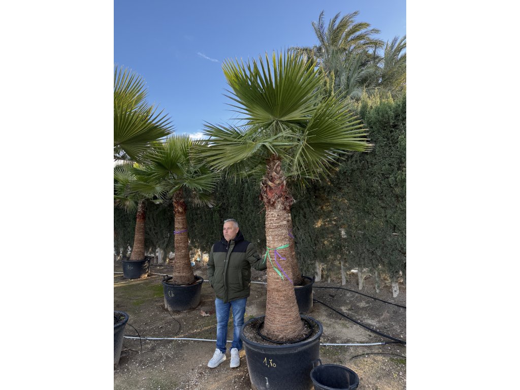 Washingtonia robusta, známá jako kalifornská vějířová palma, pochází z oblasti severního Mexika a jižní Kalifornie. Jedná se o rychle rostoucí, výrazně štíhlou palmu s elegantním vzhledem, která dorůstá výšky až 25 metrů (v nádobách samozřejmě méně).